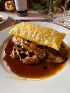 Como plato principal, llega el protagonista indiscutible: el pavo tradicional relleno, acompañado de puré de boniato y una gravy de beicon que aporta profundidad y equilibrio. Una receta clásica reinterpretada con la técnica y elegancia que caracterizan a la cocina del Ritz.