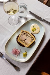 El menú incluye también una terrina de jabalí con trufa negra en costra de pan, una receta con historia vinculada al legado de Luis Irizar, transmitida de generación en generación y recuperada por Armas como símbolo de respeto a la tradición.