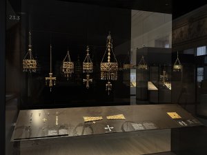 Con la ocasión de las nuevas incorporaciones, se ha llevado a cabo una reordenación del conjunto, en el que la corona de Recesvinto actúa como eje central, y en el que se exhibirán las tres piezas procedentes de la Galería de las Colecciones Reales: la corona del abad Teodosio, la cruz de Lucecio y la esmeralda grabada con la Anunciación.