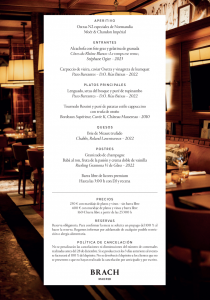 El menú arranca con ostras de Normandía y una copa de Moët & Chandon Impérial, seguido de entrantes como la alcachofa con foie gras y gelatina de granada o el carpaccio de vieira con caviar Osetra. Entre los principales destacan el lenguado con setas del bosque y el tournedo Rossini con trufa de otoño. La experiencia culmina con Brie de Meaux trufado y un babá al ron con fruta de la pasión y vainilla.
