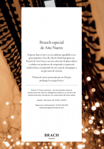 El 1 de enero, Brach Madrid propone un brunch para iniciar el nuevo año. Una selección de platos dulces y salados elaborados con productos de temporada e inspiración mediterránea, acompañados de una copa de champagne o un gin tonic de cortesía.