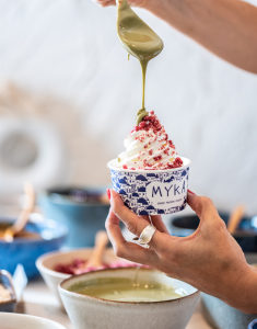 En Myka cuentan además, con 20 toppings diferentes cuidadosamente seleccionados, para realzar el sabor del helado y hacer más de 8.000 combinaciones deliciosas y sorprendentes, entre la que destaca el especial Myka, que incluye pistacho, naranja amarga, miel artesana y aceite de oliva. Adicionalmente hay frutos secos, salsas de pistacho y chocolate con avellana, stracciatela de higos, crumbles y frutas confitadas, entre otros.