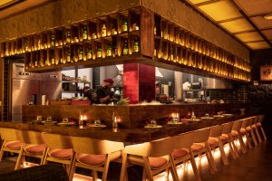 Uno de los grandes atractivos de Toritama Yakitori es su cocina abierta, donde los chefs trabajan frente al comensal sobre la robata. Ver cómo se asan lentamente pescados, carnes y verduras forma parte de la experiencia.